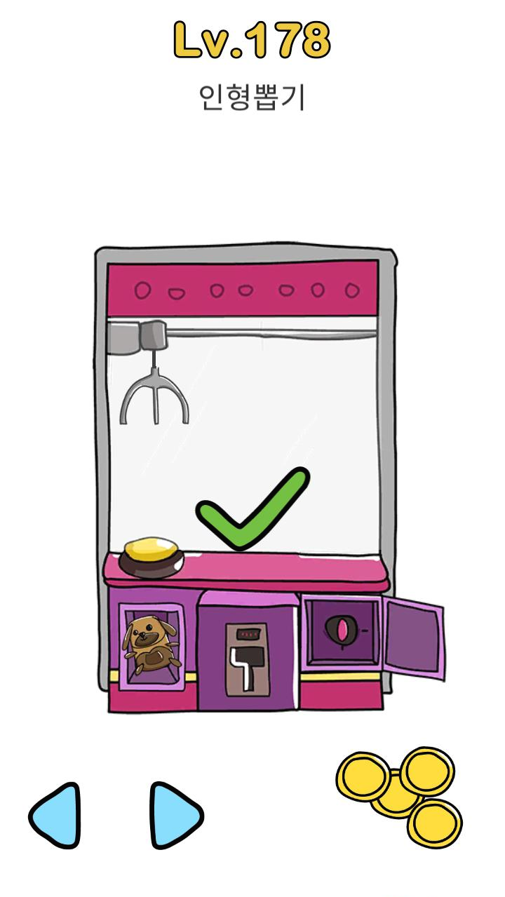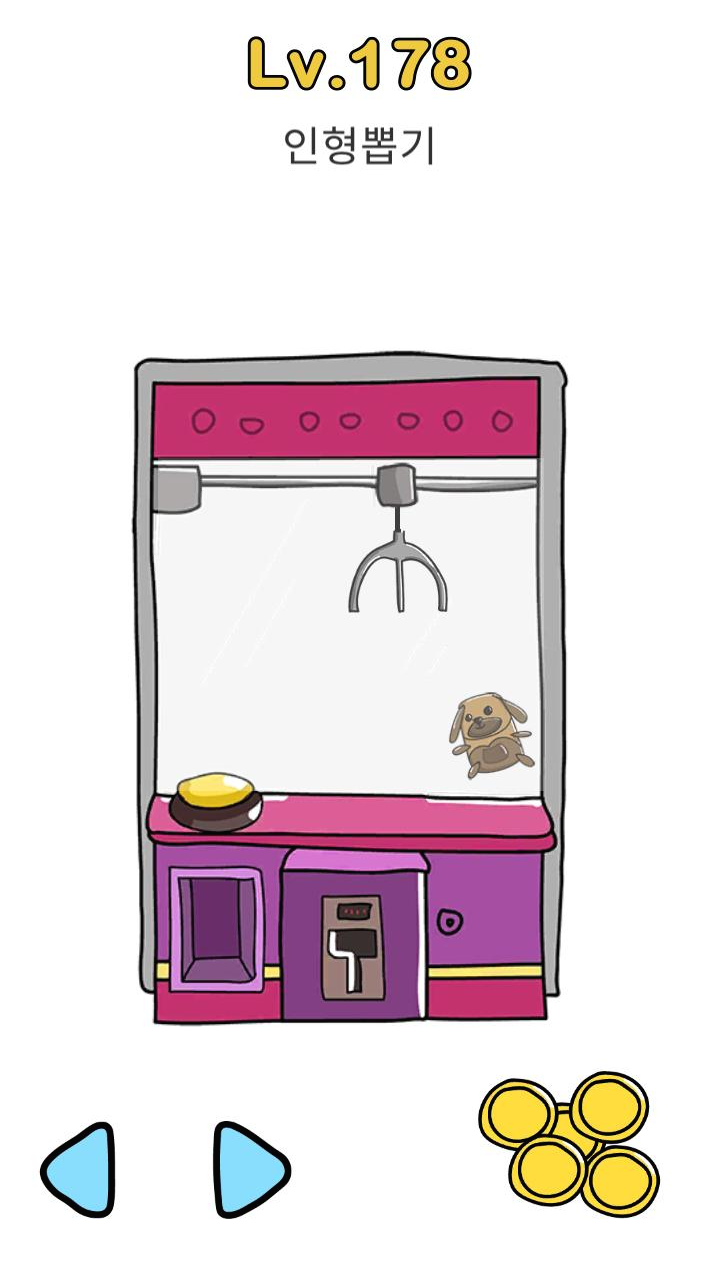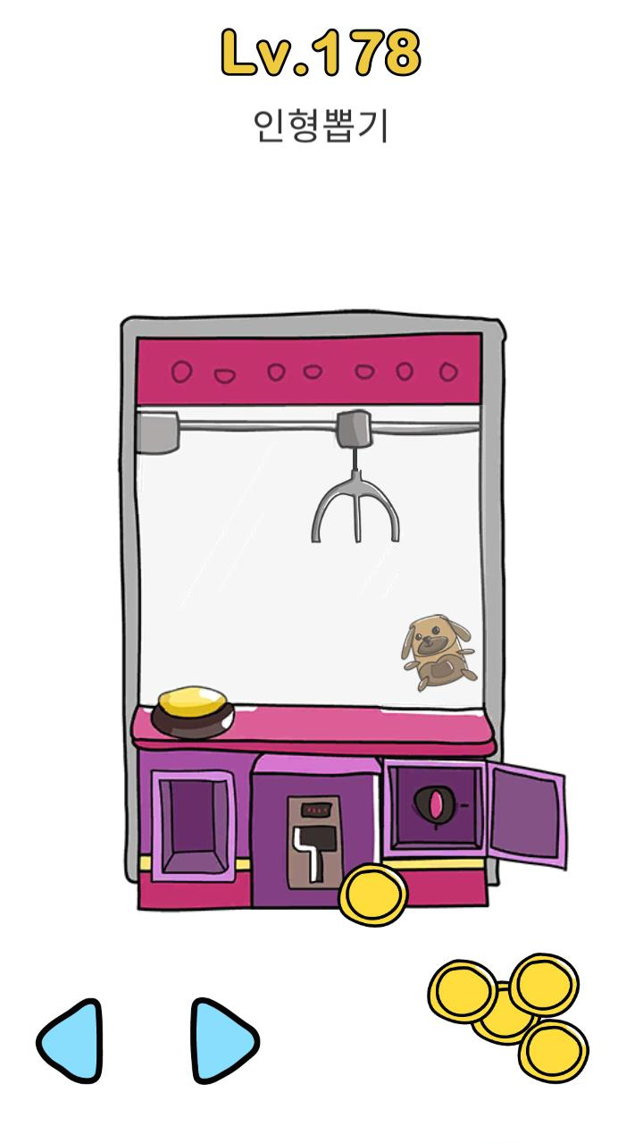 레벨182 정답 : 오른족 뚜껑을 열고 파워레버를 세로가 되게 돌린 다음 동전을 넣고 인형을 뽑는다