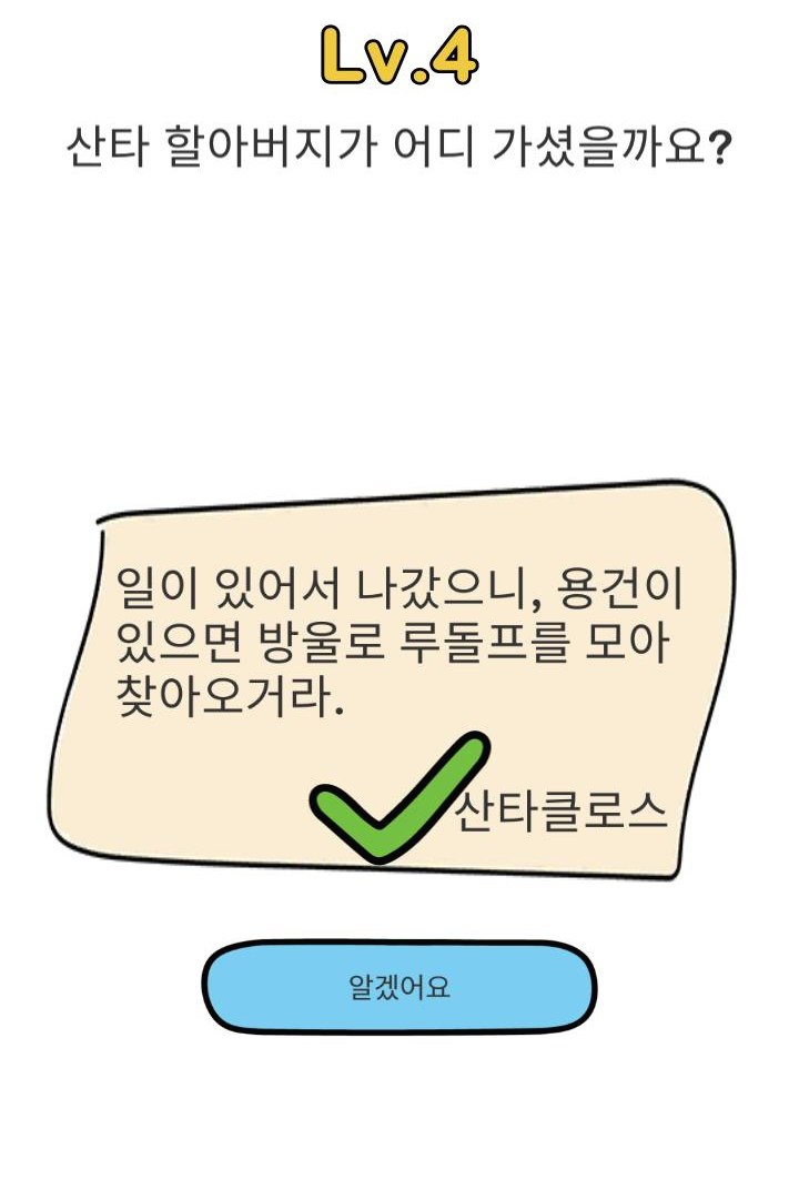 | 산타 Lv.3 집에 들어가 산타 할아버지를 찾아보세요 정답_브레인아웃 Brain Out 산타 3번 (0) | 2020.01.11 |