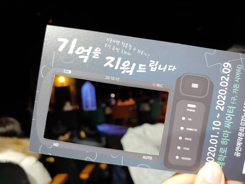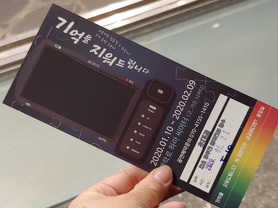 연극제목은 "기억을 지워드립니다" 티켓이 독특합니다. 사진기 모양이군요.