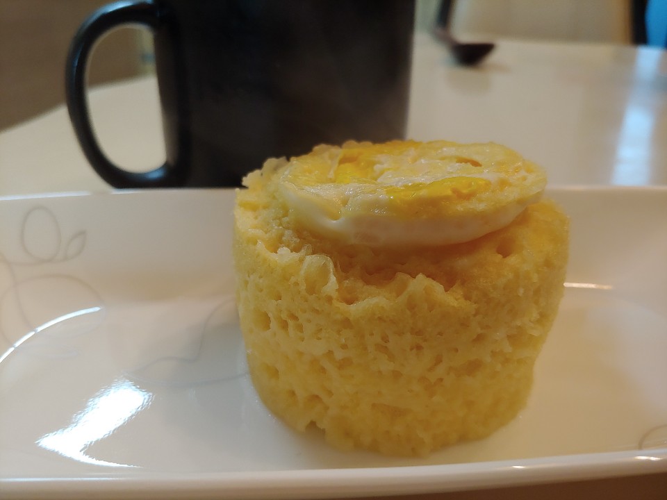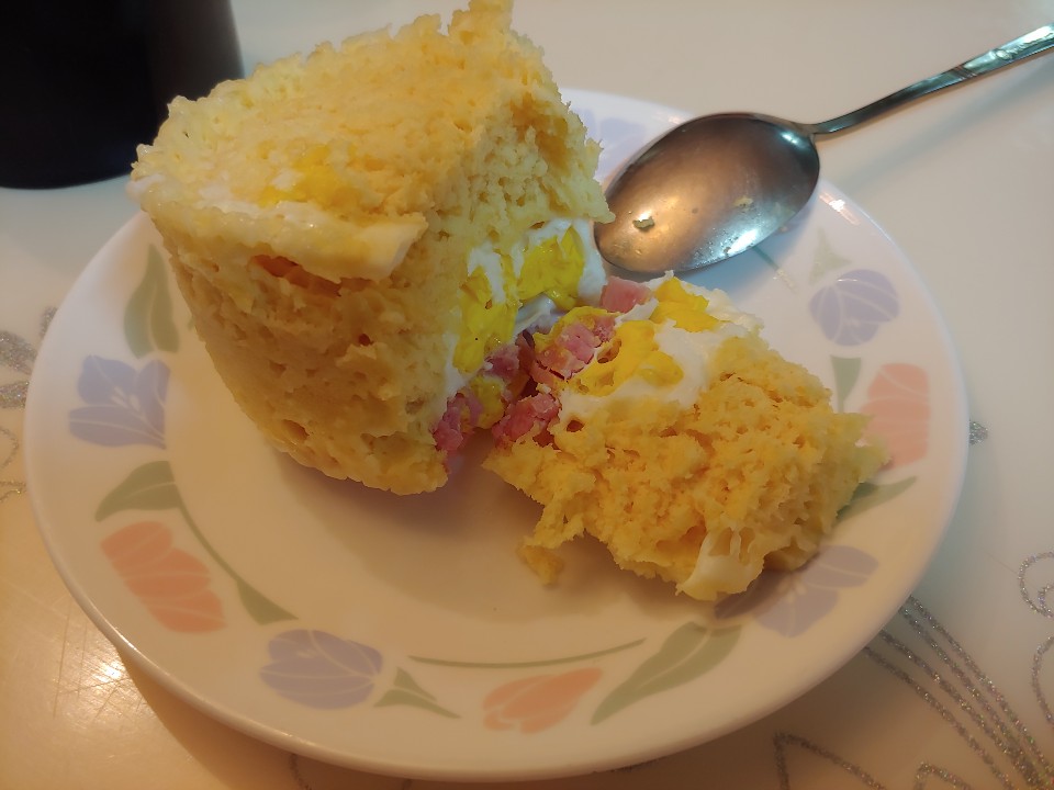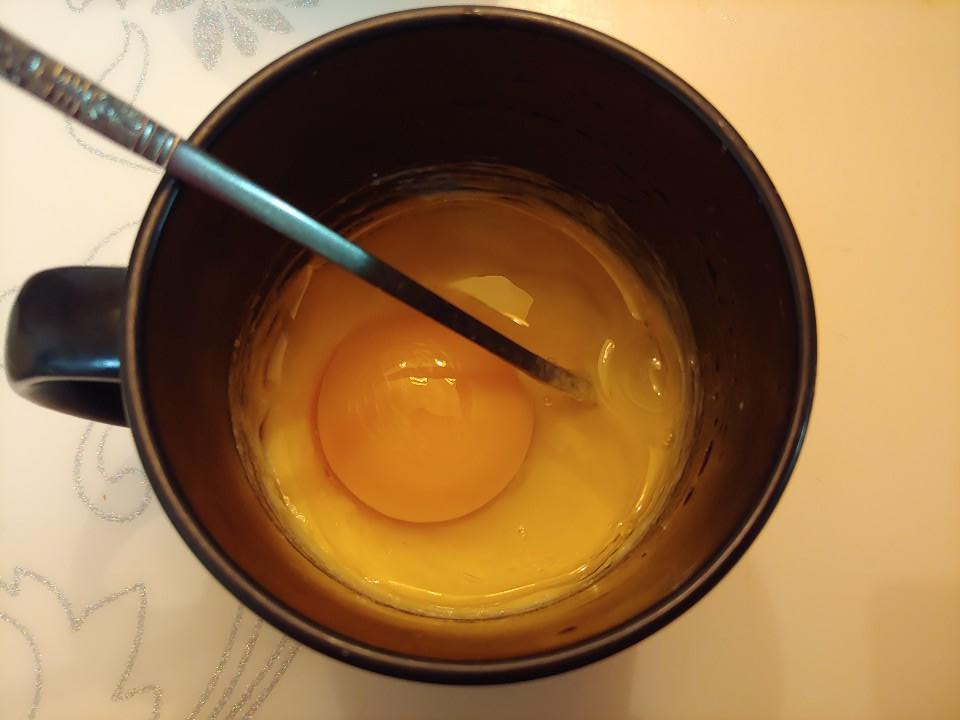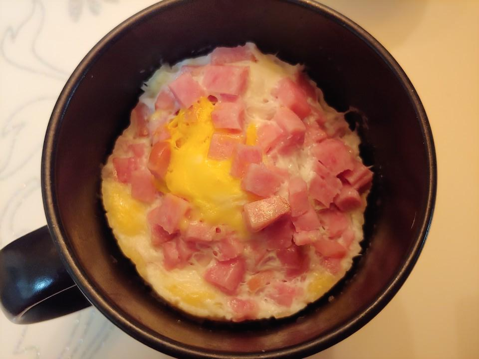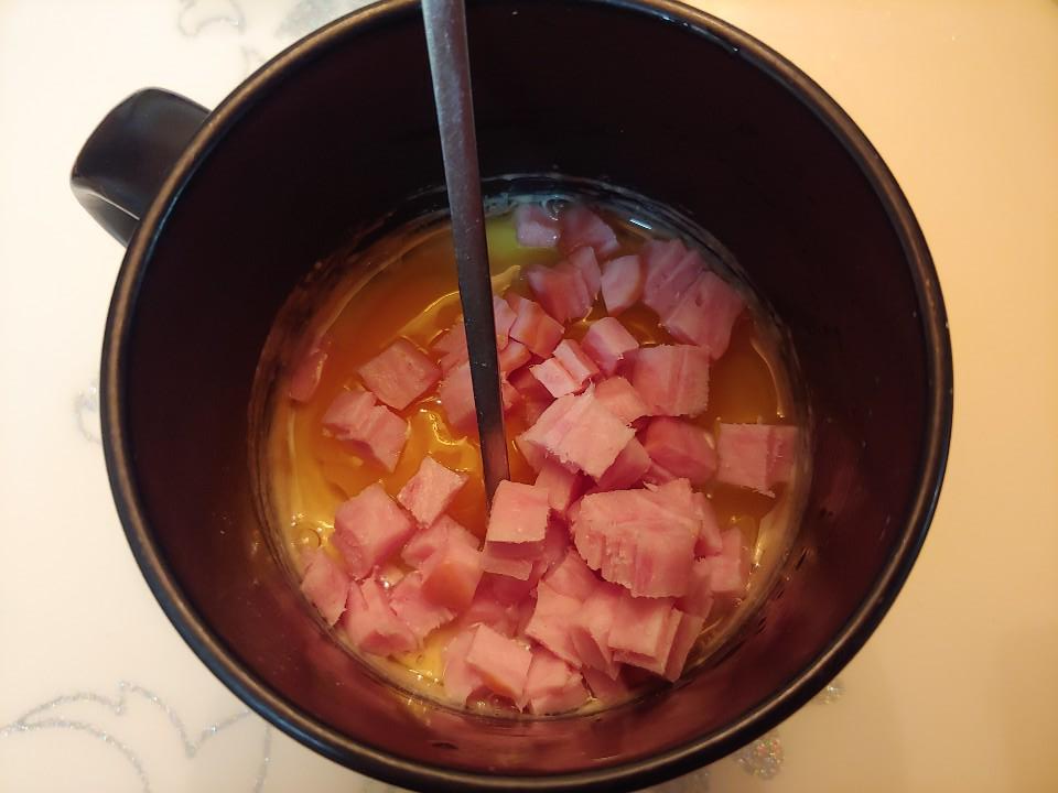 준비물 : 머그컵, 포크나 젓가락, 물 일반수저로 4스푼, 계란1개, 햄 조금, 전자렌지