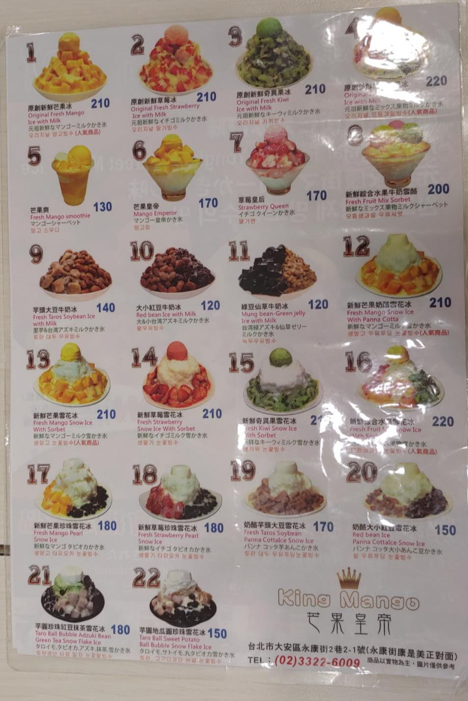 오리지날과 눈꽃빙수중에 고민하다가 눈꽃빙수를 선택했어요~ 비쥬얼은 좋습니다. 제가 사진을 잘 못찍어서 그래요..ㅡㅡ;; 맛은..보통이었어요.. 한국에서 먹던 맛...그렇지만 대만이라는 장소가 주는 특별함이 더해져서..나쁘지 않았습니다. 메뉴가 깔끔하게 정리된 것을 보여줘서 주문할때 아주 편했어요~ 한글로도 적혀있고..^^