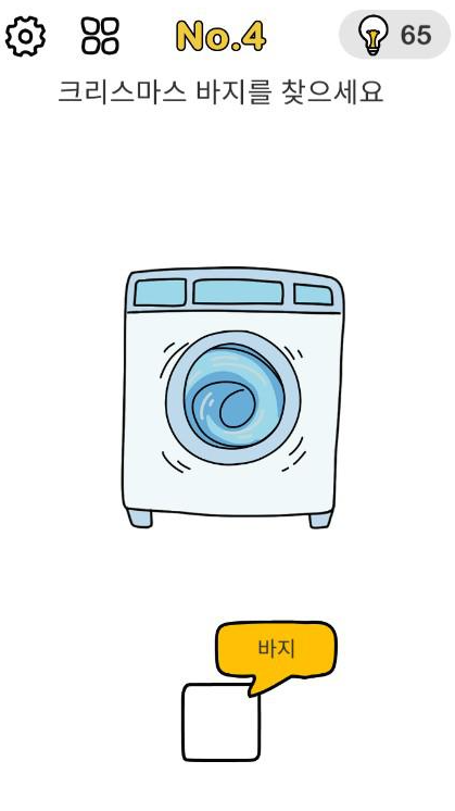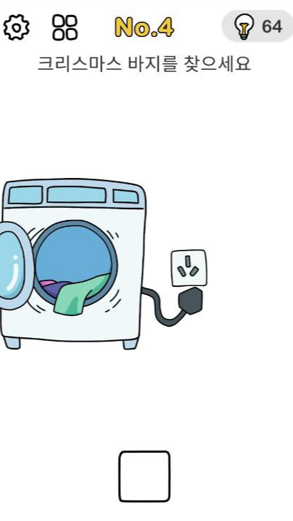 산타 도와주기 4번 정답 : 두 손가락으로 세탁기를 왼쪽으로 옮긴 다음 플러그→세탁기 순서로 터치하여 문을 열고, 마지막 바지 한 벌을 꺼내 사각 프레임으로 이동