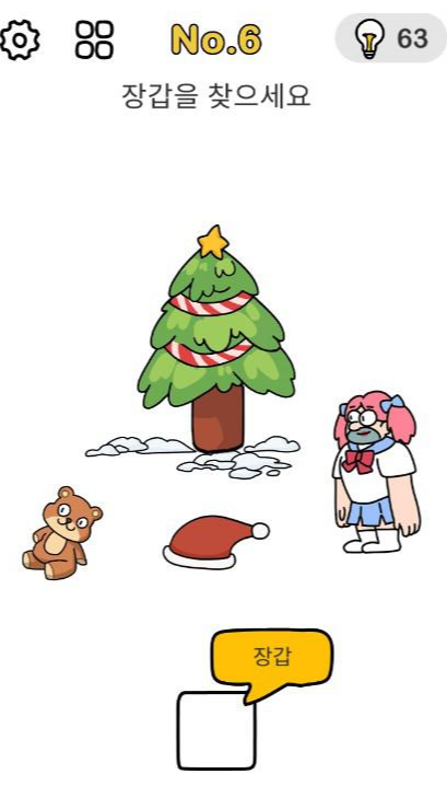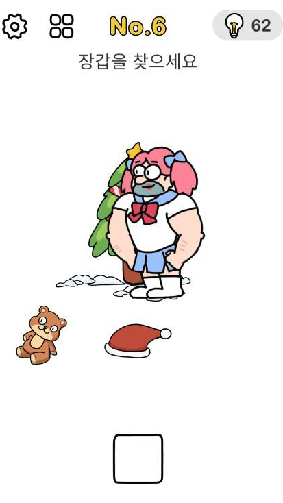 산타 도와주기 6번 정답 : 캐릭터를 확대한 후 나무에 여러 번 부딪쳐 장갑이 떨어지면 사각 프레임으로 이동