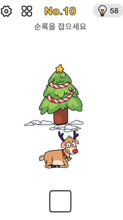 산타 도와주기 10번 정답 : 헌터를 화면 밖으로 밀면 순록이 가운데 앉음. 순록을 끌어 사각프레임 안으로 이동