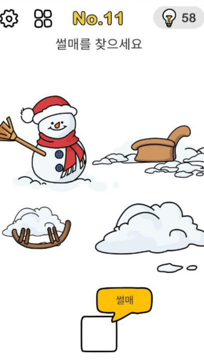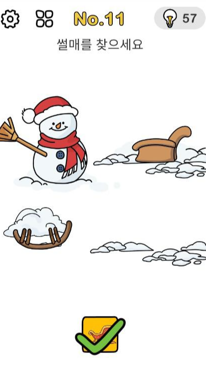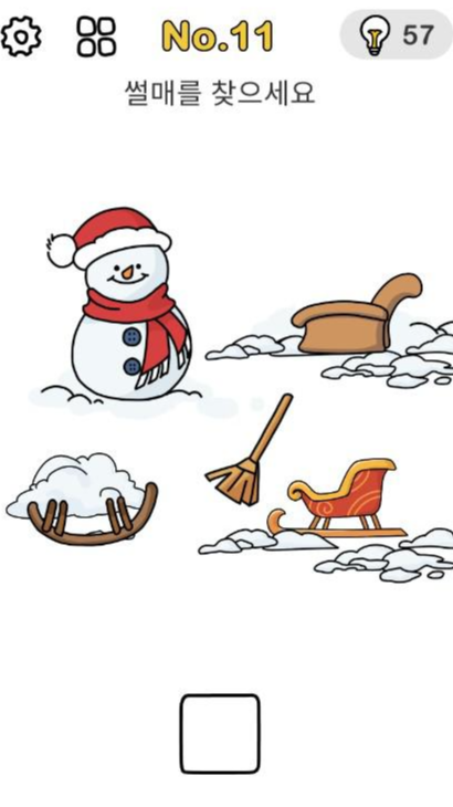 산타 도와주기 11번 정답 : 눈사람의 빗자루를 집어 눈더미를 썰면 썰매가 나옴. 썰매를 사각프레임 안으로 이동