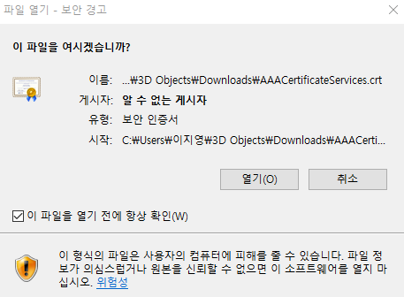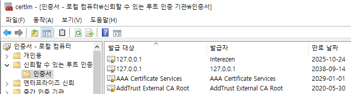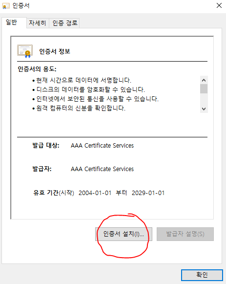 AAA Certificate Services 를 다운받아 수동설치 하였습니다