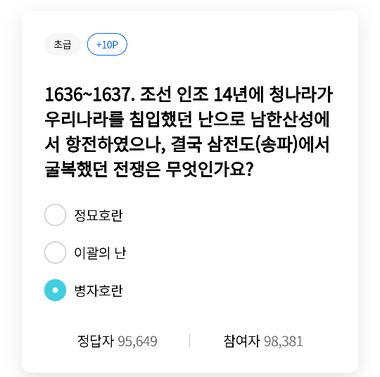 1636~1637. 조선 인조 14년에 청나라가 우리나라를 침입했던 난으로 남한산성에서 항전하였으나, 결국 삼전도(송파)에서 굴복했던 전쟁은 무엇인가요?
