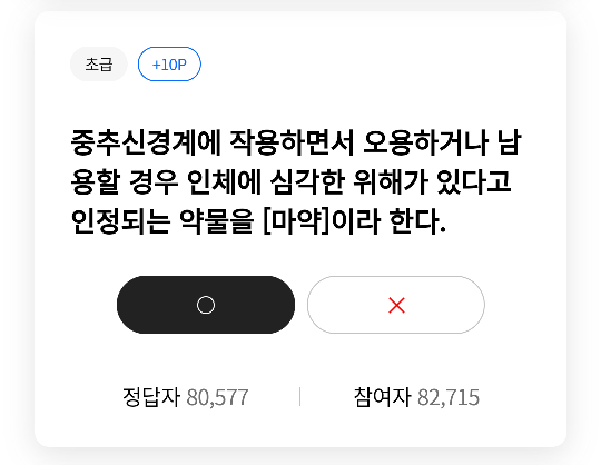 중추신경계에 작용하면서 오용하거나 남용할 경우 인체에 심각한 위해가 있다고 인정되는 약물을 [마약]이라 한다.