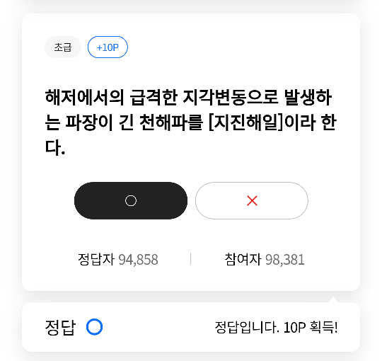 해저에서의 급격항 지각변동으로 발생하는 파장이 긴 천해파를 [지진해일]이라 한다.