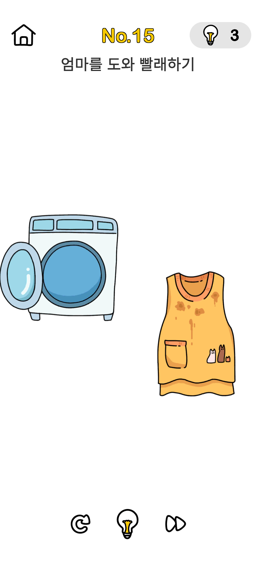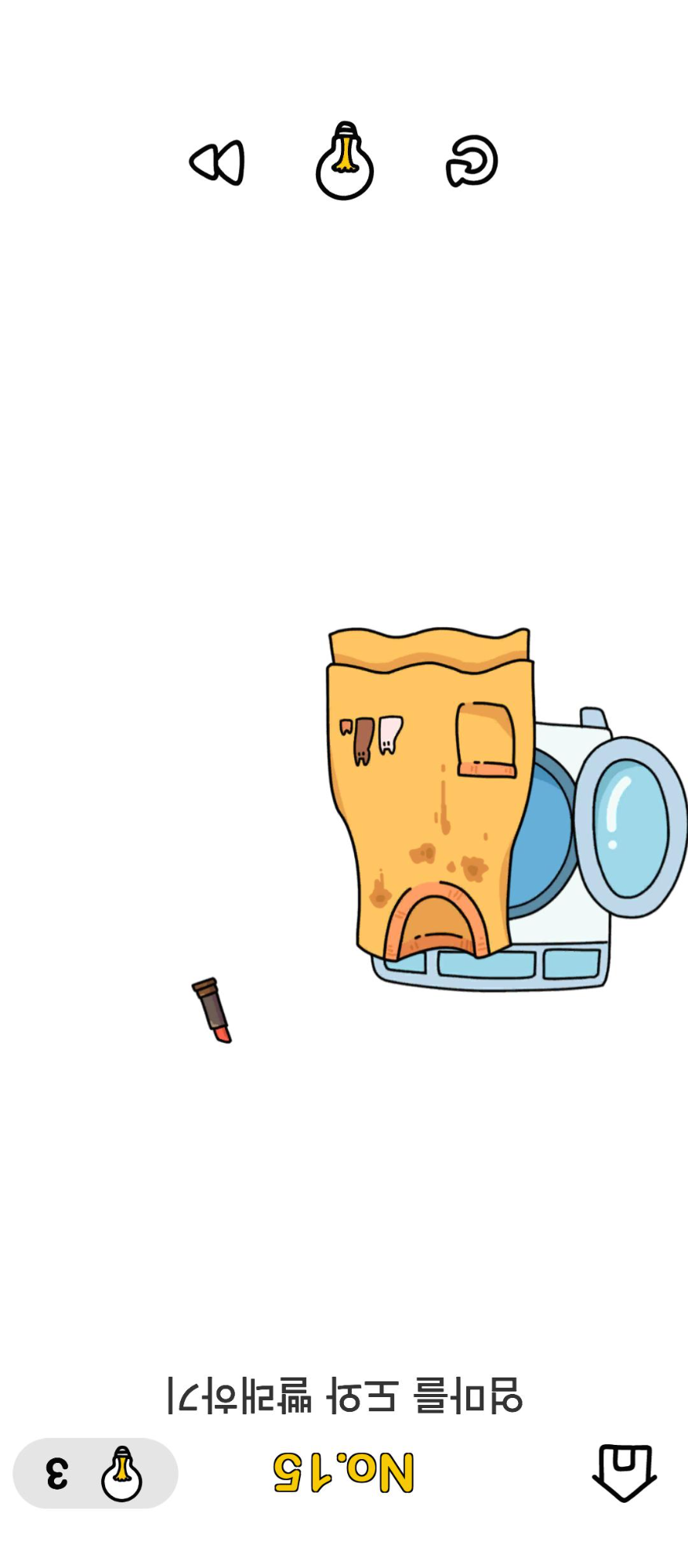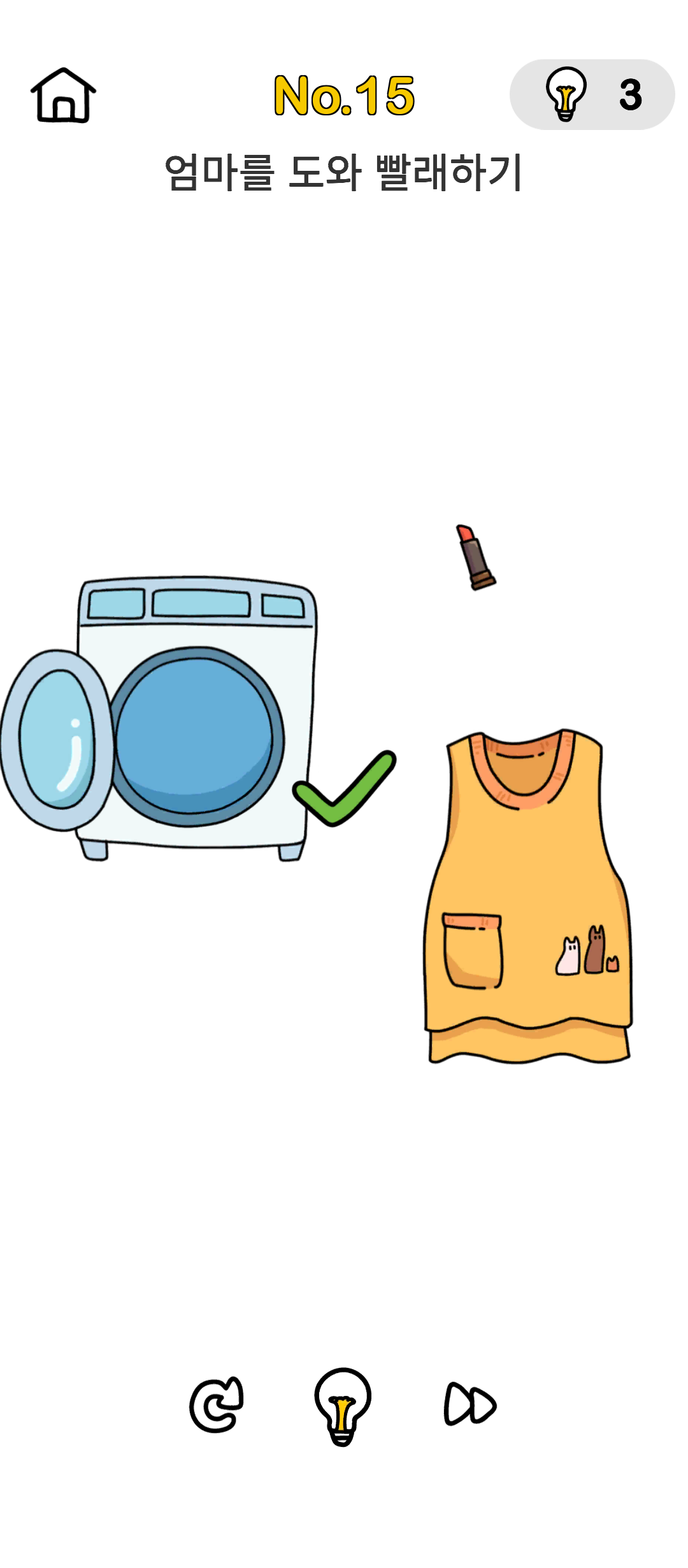 엄마돕기 15 레벨 정답 : 화면을 뒤집어서 주머니에서 립스틱을 빼고 세탁기에 넣는다