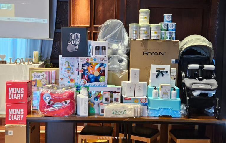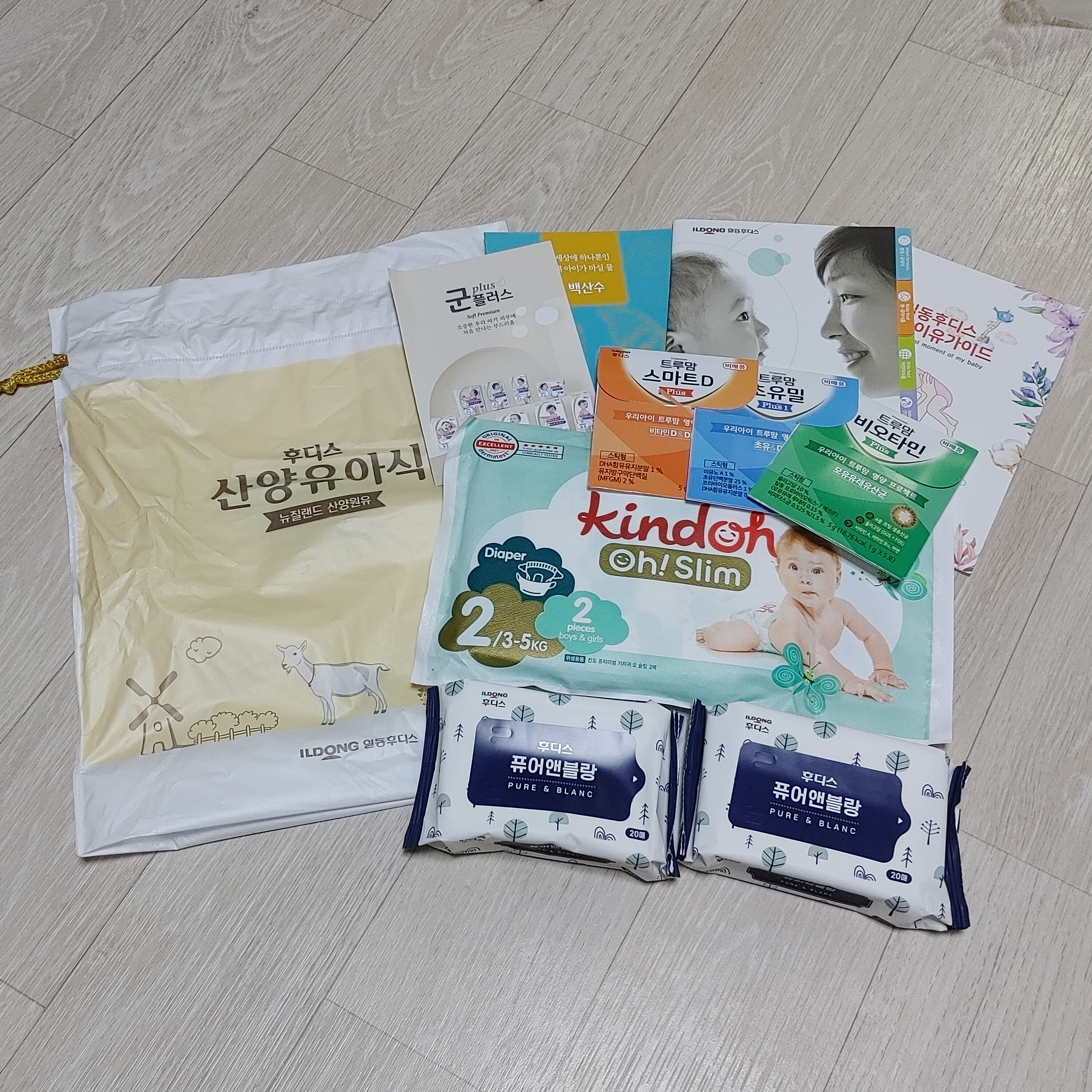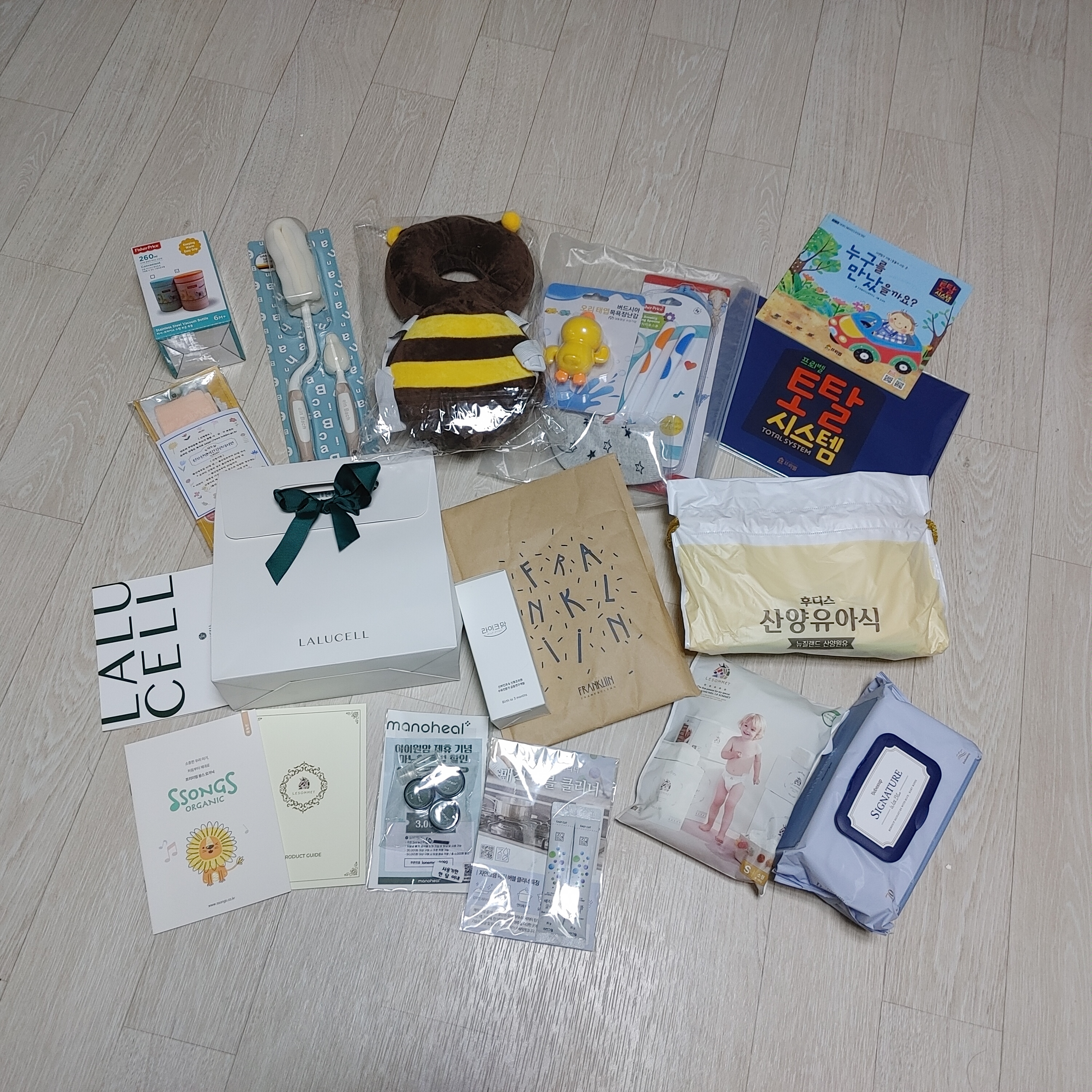 후디스(물티슈,기저귀,분유에 넣는 영양제), 마노힐 화장품 샘플, 프랭클린 저장팩 샘플, 라이크맘 젖병, 매직버블클리너 샘플, 꿀벌머리쿵쿠션, 르소메 기저귀 샘플, 프뢰벨 미니북 샘플, 유아양말, 베베숲 물티슈, 아가랑 탯줄도장 제작권, 라루셀화장품샘플