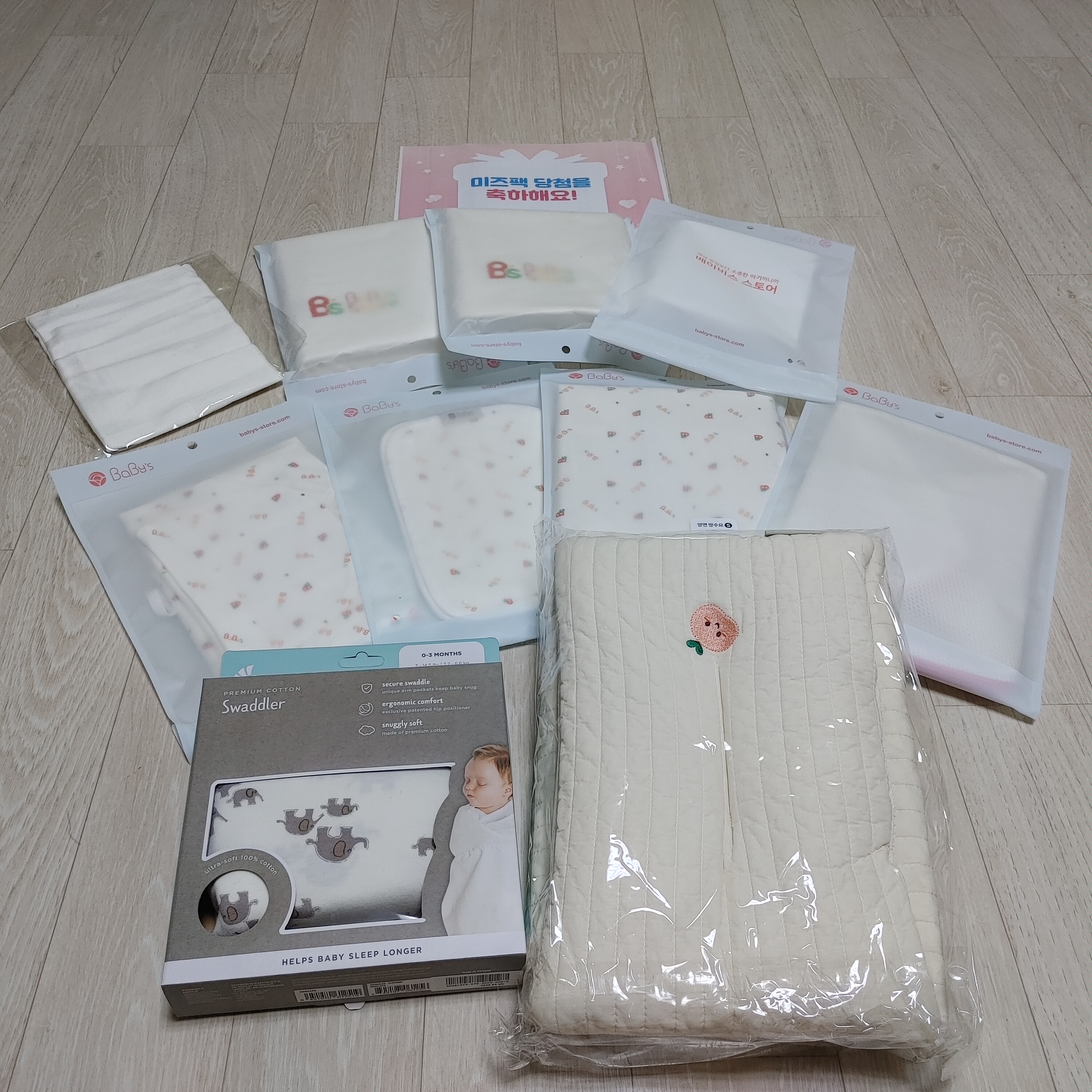 로토토역류방지쿠션, 에르고베이비스와들러속싸개, 맘스네이처배게+낮잠패드, 베이비스토어배냇저고리+모자, 베이비스토어아기띠침받이, 베이비스토어방수요, 베이비스토어아기타올2장, 베이비스토어가제손수건10장 , 베이비스토어대나무블랭킷, 베이비스토어세탁망