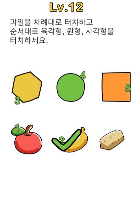 레벨12 정답 : 과일 2개 선택 후 도형 차례로 선택